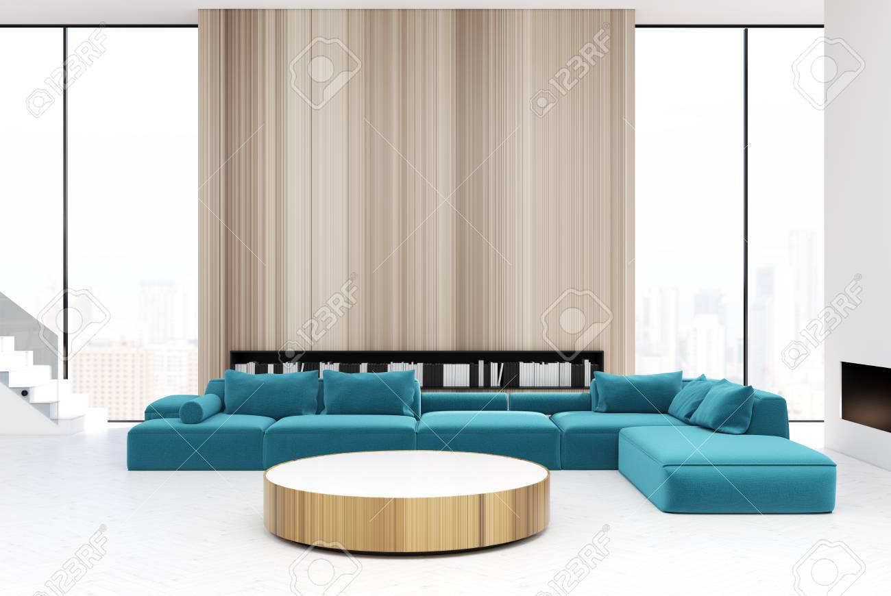 Interior Blanco Y De Madera De La Sala De Estar Con Una Mesa