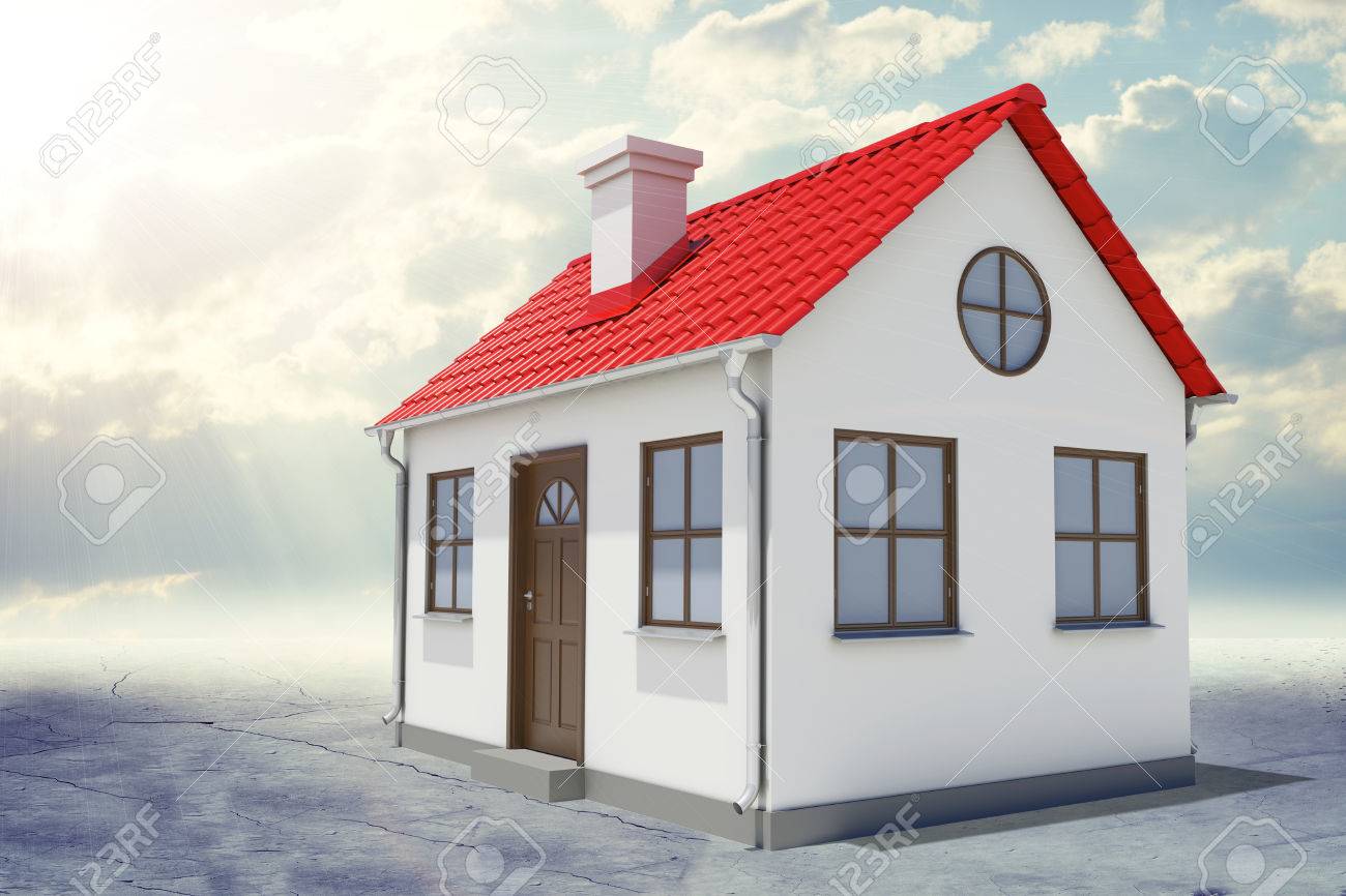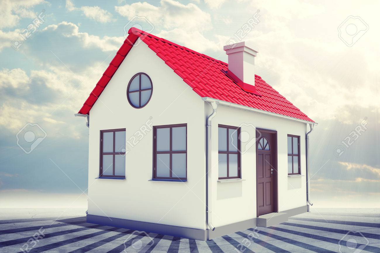 Pequena Casa Con Techo Rojo Sobre Fondo Gris Abstracto Cielo Fotos