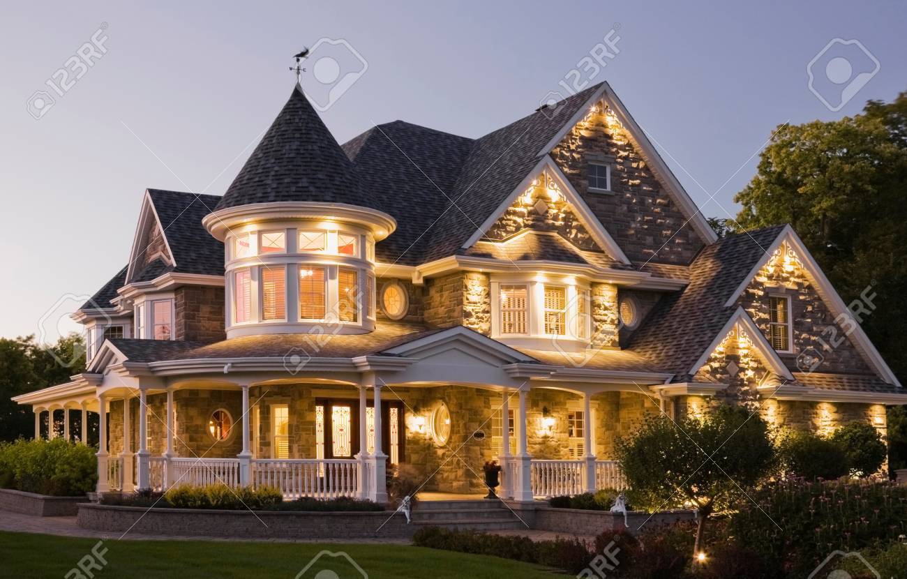 Elegante Casa De Piedra Gris Con Adornos Blancos Y Techo Azul Al