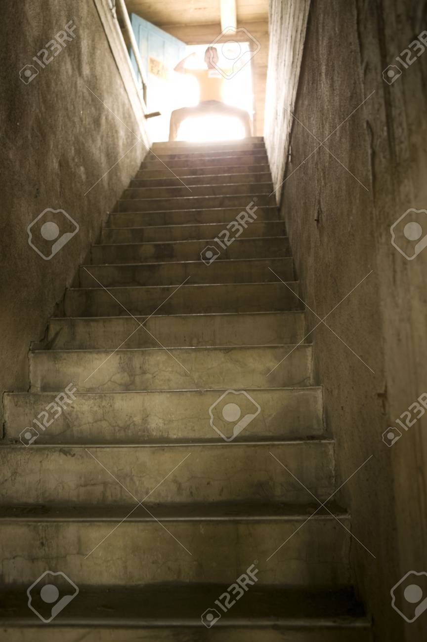 Hombre En La Parte Superior De La Antigua Escalera De Hormigon