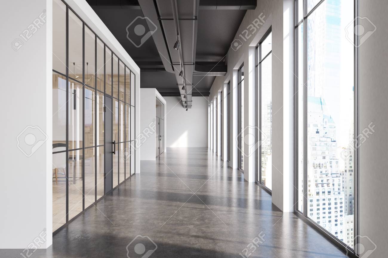 Vestibulo De Oficina Con Paredes De Vidrio Y Blanco Piso De