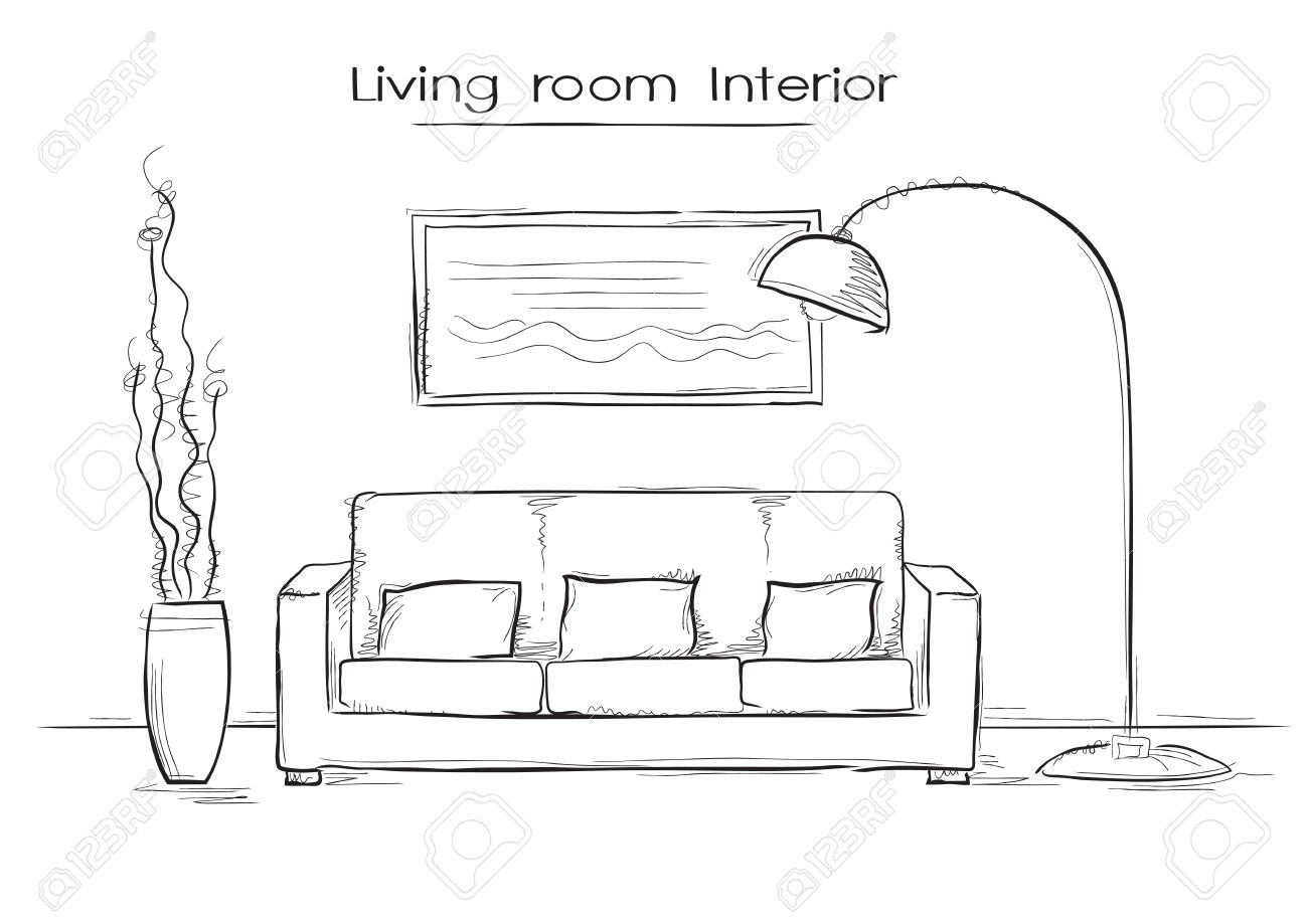 Hand Drawn Sketch Of Modern Living Room Interior With A Couch And