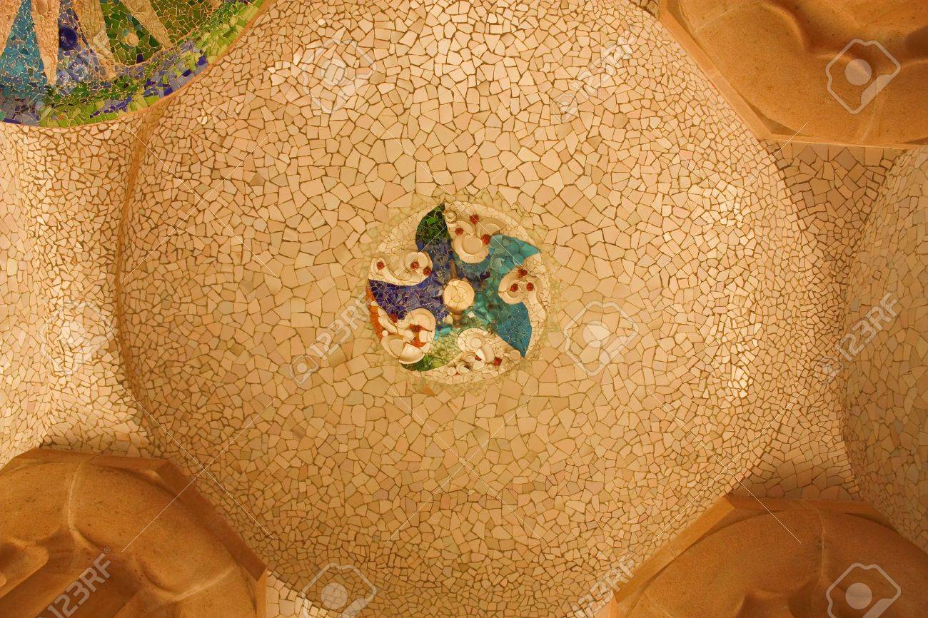 Ceiling Decorated With Mosaics In Sala Hipostila At Parc Guell