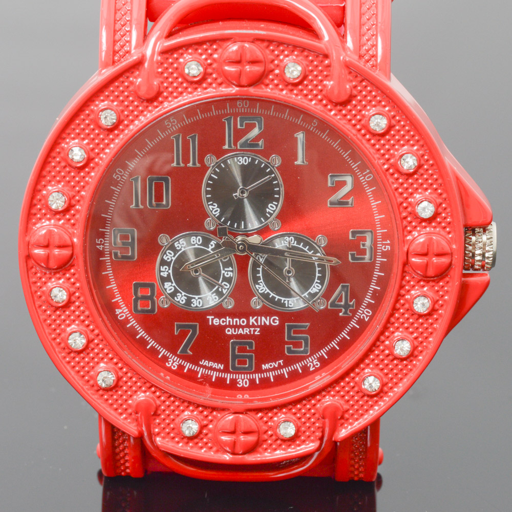 Techno King Hip Hop Cz Ice Bling Red Bullet Band Watch Techno