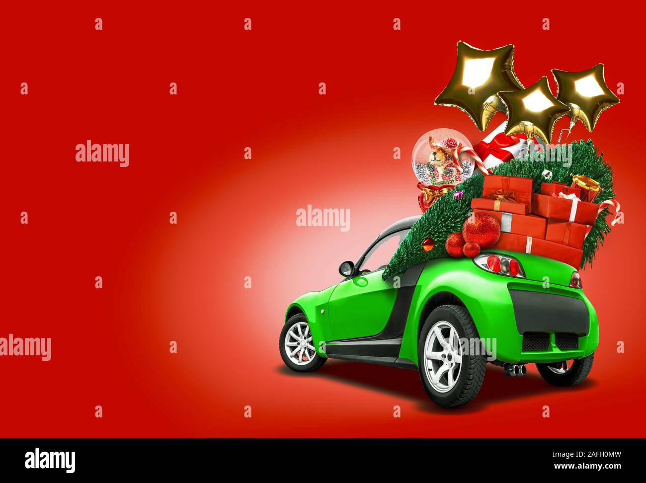 Coche Verde Sobre Fondo Rojo Arbol De Navidad Cajas Globos En