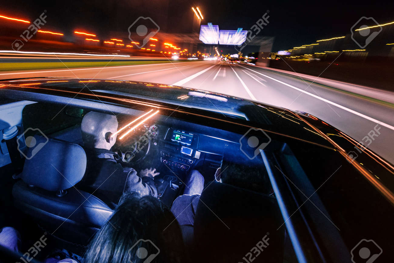 Conducir Por La Noche En Una Carretera Con Personas En El Coche
