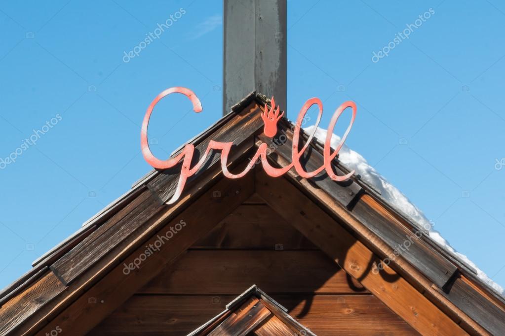 Signo Rojo Parrilla En Techo Inclinado De Madera Cubierto De Nieve