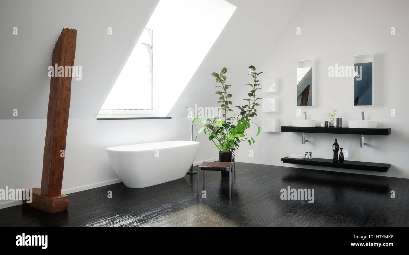 Blanco Y Negro Moderno Bano Atico Con Vigas De Soporte De Madera
