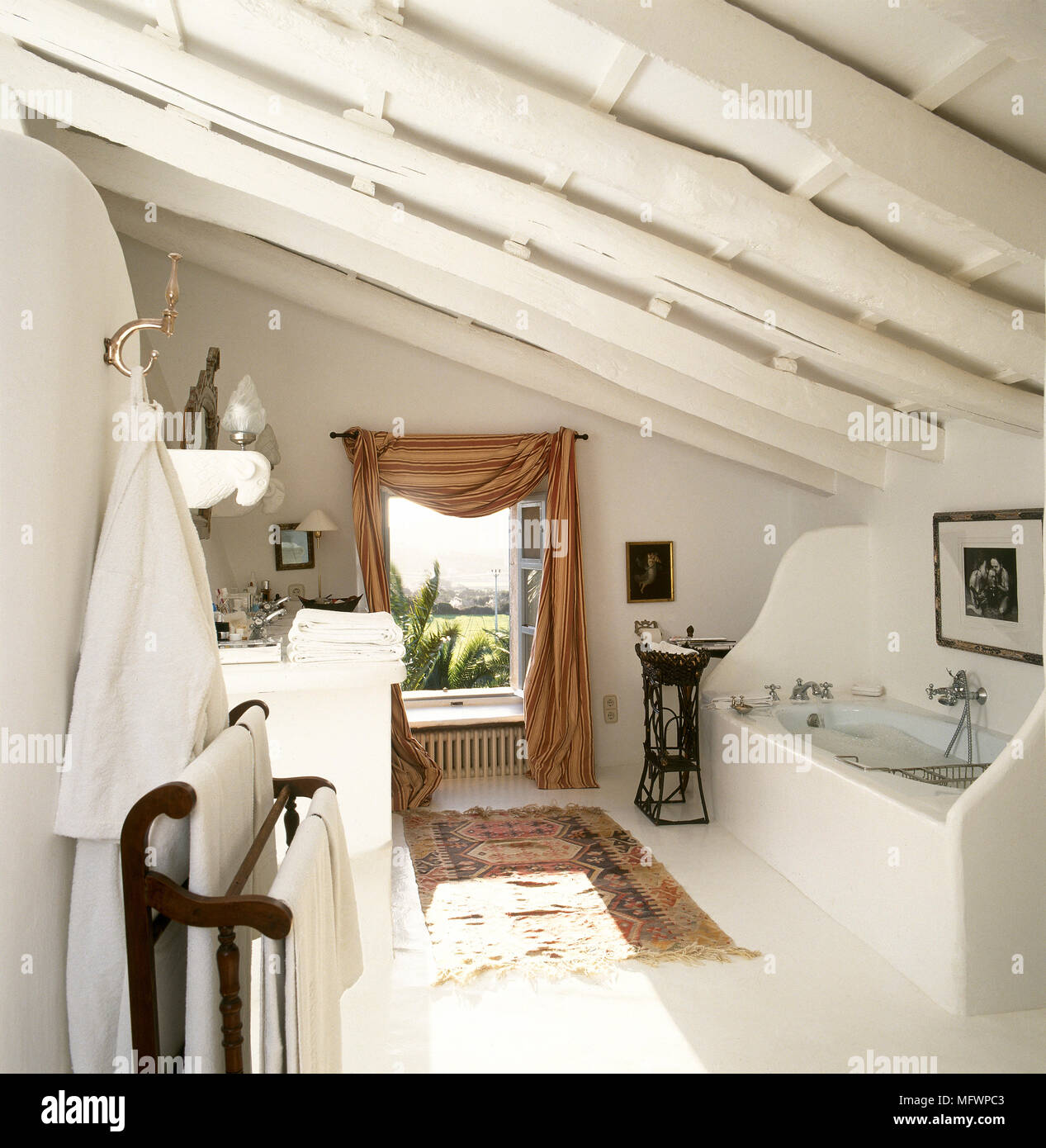 Country Style White Bathroom With Beamed Ceiling And Stone Bath