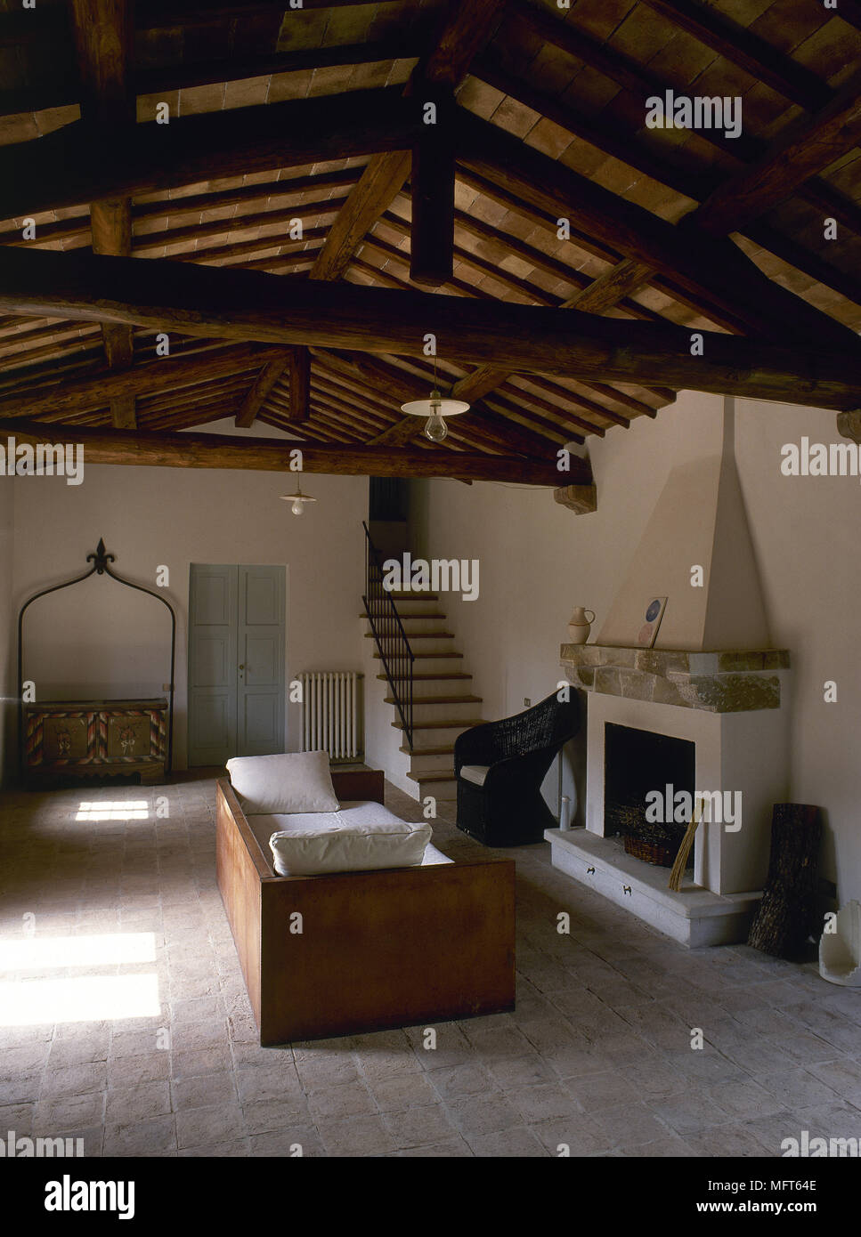 Terracota Rustico Salon Con Techos De Madera Y Chimenea Patron De