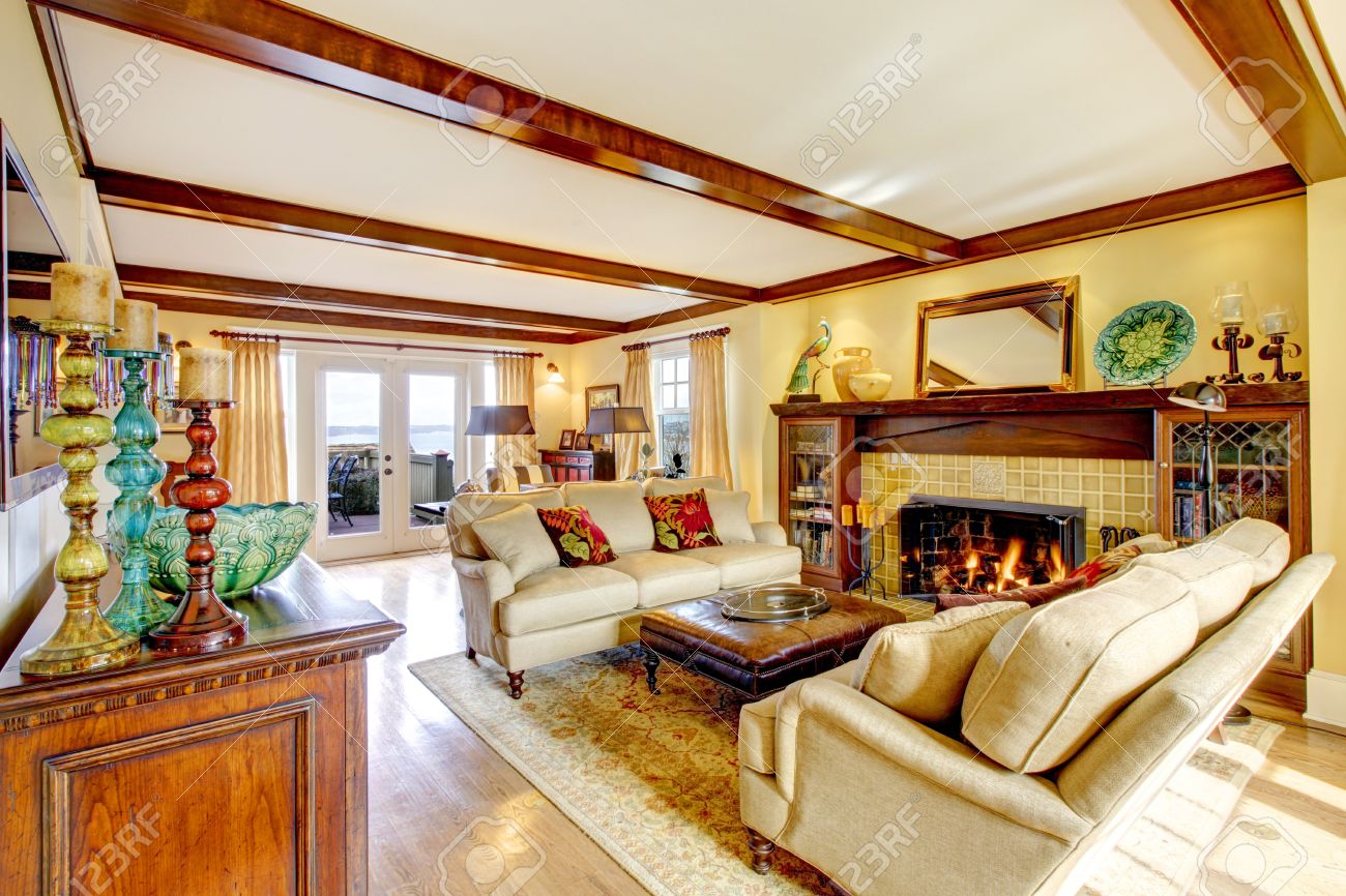 Estilo Rustico Salon Con Techo Con Vigas De Madera Y Chimenea